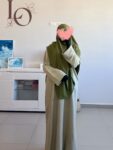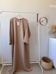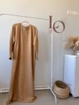 **Abaya Hajar en tissu lin**, une abaya simple et pratique avec des poches latérales cachées.